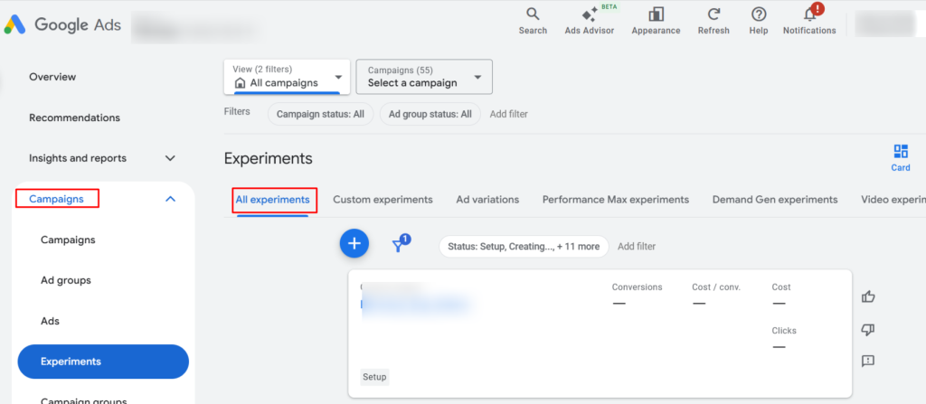 - In your Google Ads account, click Campaigns → then the “Experiments / All Experiments” menu.