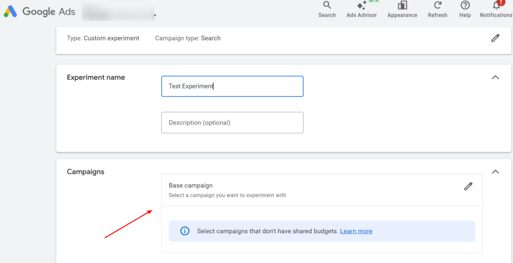 - Pick the original (base) campaign to test against. The experiment will derive from this campaign.