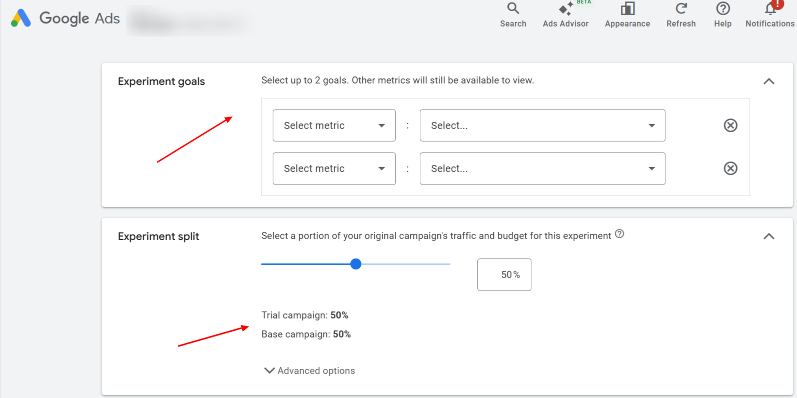 • Search-based split: each search may be randomly assigned to base or experiment (users could see both). - Select the objective metric(s). Google lets you choose up to two metrics but all metrics are still reported. Select goals that align with the specific change you’re testing. For example: