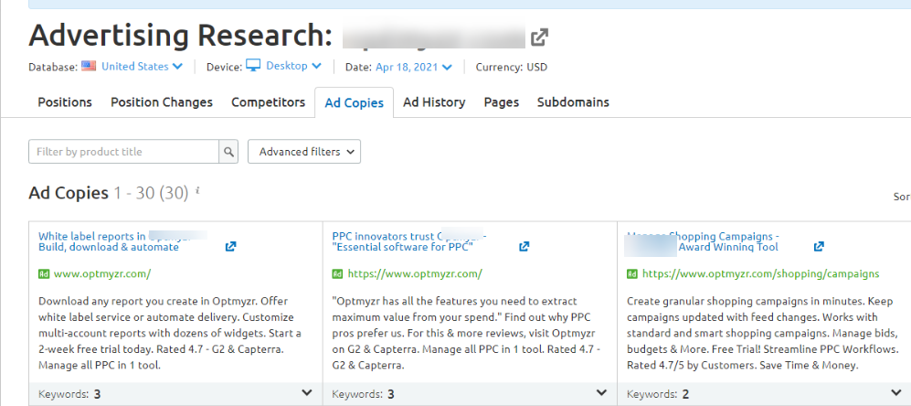 SEMrush can help you review your competitors’ ad copies by using the SEMRush Ad Copies Report.  With this report, you will have an idea of what your competitors are offering. Are they using any specific call to action or any specific keyword? etc. And this way, you can analyze your ad copies and make changes suitably.